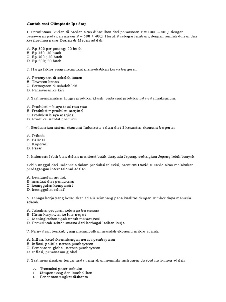 Dikutip dari buku BTS Bahas Tuntas Soal OSN IPS karya Fitri Lianingsih, berikut ini adalah kumpulan soal pilihan ganda OSN IPS untuk jenjang SMP/MTs yang dilengkapi dengan jawaban kuncinya: