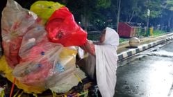 Di tengah hujan yang masih turun di atap, seorang wanita paruh baya berkerudung putih mendorong gerobak tua. Tumpukan sampah menumpuk di dalam gerobak tersebut.