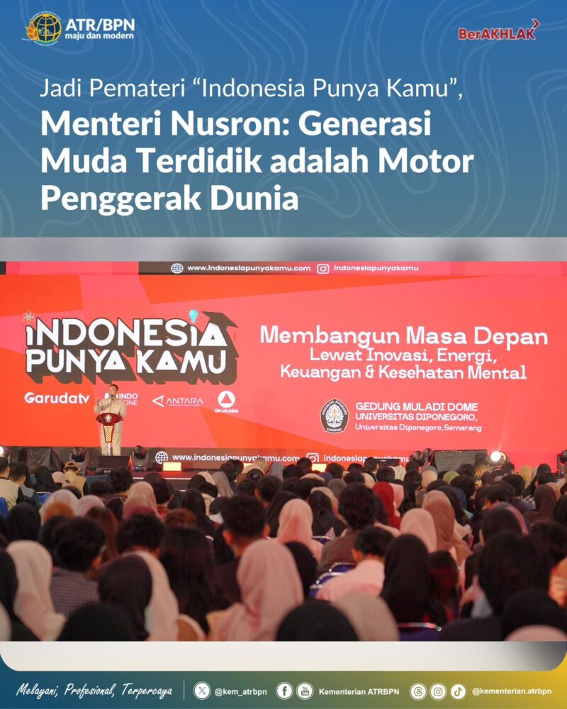 Semarang, tujuhmenit.com – Menteri Agraria dan Tata Ruang/Kepala Badan Pertanahan Nasional (ATR/BPN), Nusron Wahid, mendorong generasi muda untuk berperan aktif dalam membangun tata ruang dan pertanahan Indonesia yang adil, modern, serta berkelanjutan. Saat menjadi pemateri di Universitas Diponegoro (UNDIP) dalam acara Indonesia Punya Kamu, Menteri Nusron menyebut mahasiswa adalah kelompok intelektual yang memiliki kapasitas untuk memimpin perubahan sosial dan pembangunan di Indonesia.