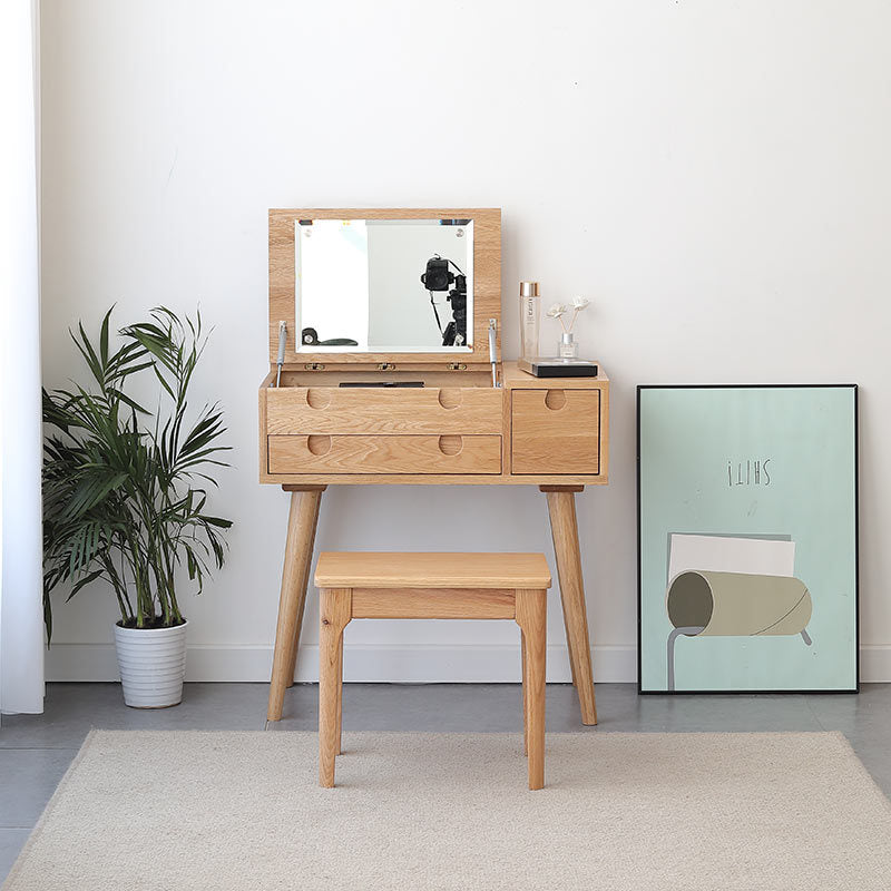 Meja rias dari bahan kayu bisa menjadi pilihan yang sesuai bagi Anda karena memberikan kesan hangat dan alami. Bahan ini juga dikenal kokoh dan tahan lama, sehingga cocok digunakan dalam jangka waktu yang panjang. Dengan warna serta tekstur khasnya, meja rias kayu sangat sesuai untuk gaya desain minimalis, skandinavia, atau modern klasik.